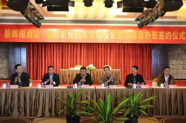 空格School leaders attended the signing ceremony of the vice president of Chaoshan Vocational and Technical College, Mr. Dan Zhendong, Mr. Li Yuhua, assistant dean of Chaoshan Vocational and Technical College of foreign exchange and cooperation department deputy director Mr. Zhong Xiaobin, Mr. Chen Jiangsheng, director of the Department of trade and Commerce and trade department Ms. Chen Biling, deputy director of the General Department of Commerce and trade department director Ms. Tang Chen; Biforyo Garden Hotel General Manager Mr. Jiang Yibin Biforyo Garden Hotel, the standing deputy general manager Mr. Chen Guibing, Biforyo Garden Hotel deputy general manager Mr. Chen Hongzhi, human resources director Mr. Zhu Jun, chief financial officer, Mr. Zhang Lizhong Kangle, director of Mr. Zhang Guojun.