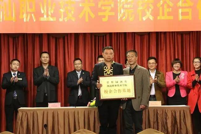 空格Standing Biforyo Garden Hotel deputy general manager Mr. Chen Guibing on behalf of the hotel and the Chaoshan Vocational and Technical College signed a cooperation agreement; vice president of Chaoshan Vocational and Technical College Mr. Dan Zhendong Biforyo Garden Hotel cooperation base awarding.