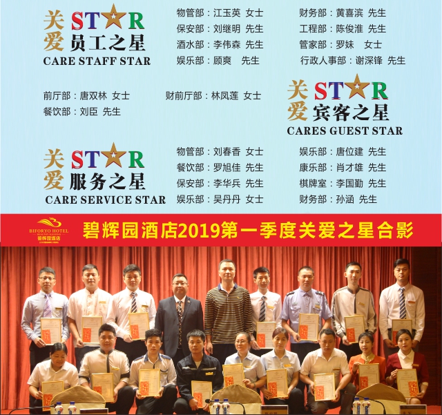 为倡导酒店“关爱文化”,表彰2019年第一季度对酒店“关爱员工·关爱宾客·关爱服务”做出优秀成绩的典型模范,对以下人员授予2019年第一季度“关爱之星”荣誉称号。