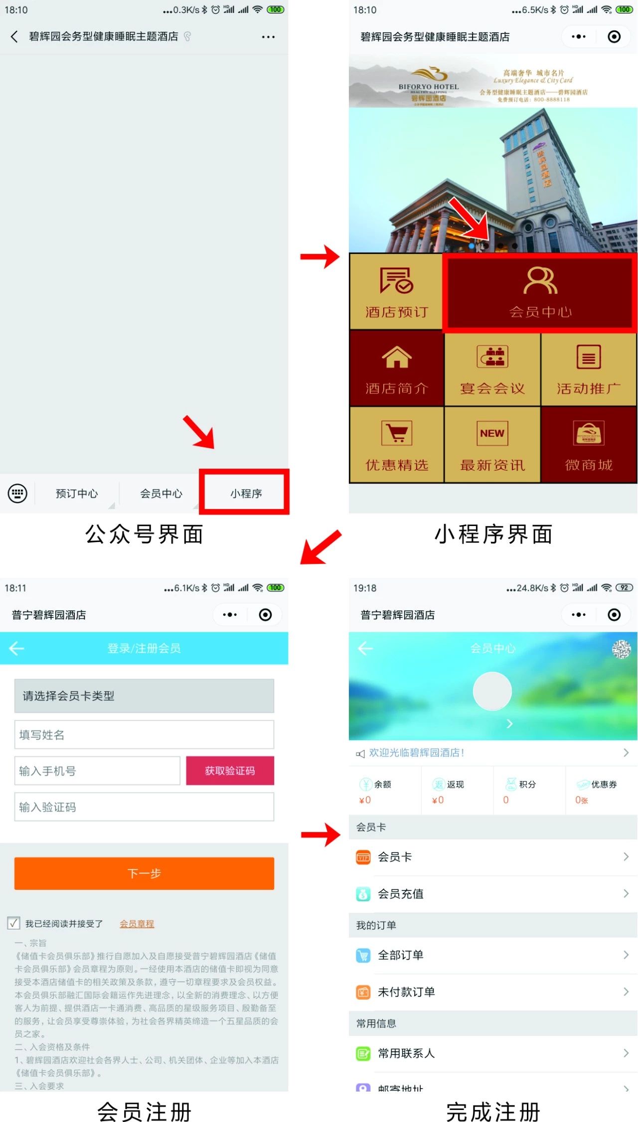 ①、扫描关注碧辉园酒店二维码或酒店小程序,进入公众号找到最下方小程序;